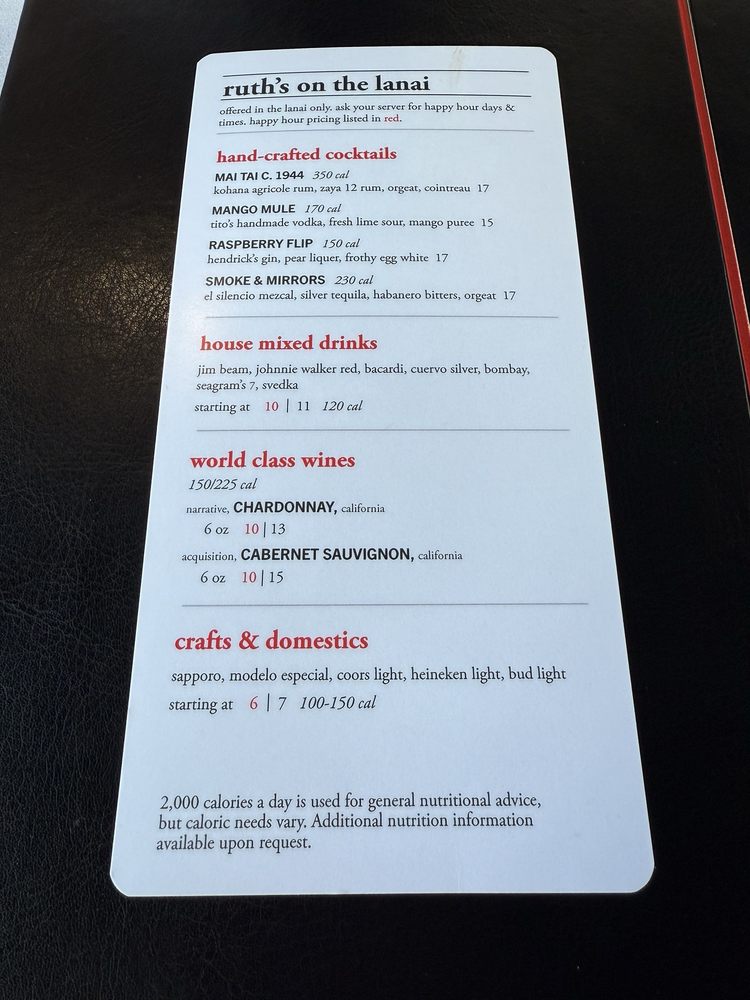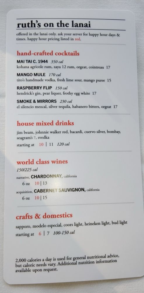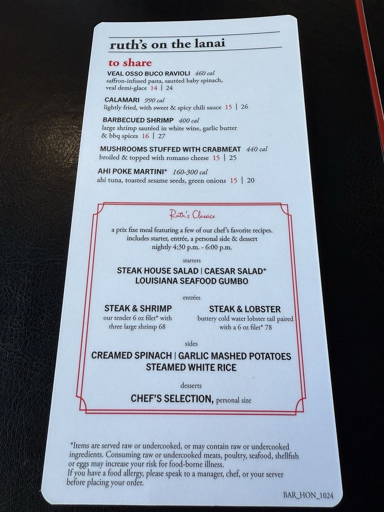 “ We had a fantastic time at Ruth's for the first time in over 20 years. We started with happy hour on the lanai, where we tried the mushrooms stuffed with crabmeat. Ruth's choice of steak and lobster, filet was petite, but it was cooked perfectly. Overall, it was an awesome experience, and we definitely plan to come back for dinner inside the restaurant. Unfortunately, I didn't enjoy the outdoor seating on the lanai. Bad sewer smells... ”